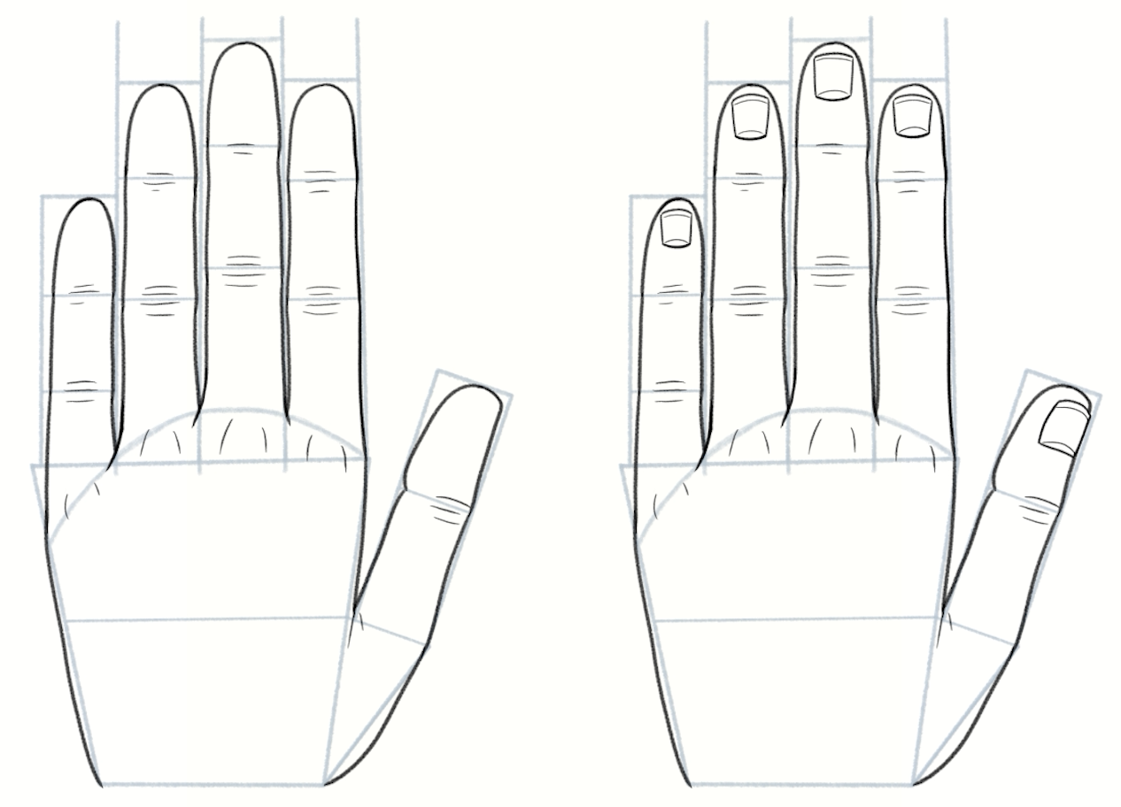 7. Agregue líneas como guías para cada articulación. Como se muestra en 7b, el segmento inferior es el más largo y los otros segmentos se acortan hacia la punta de los dedos.