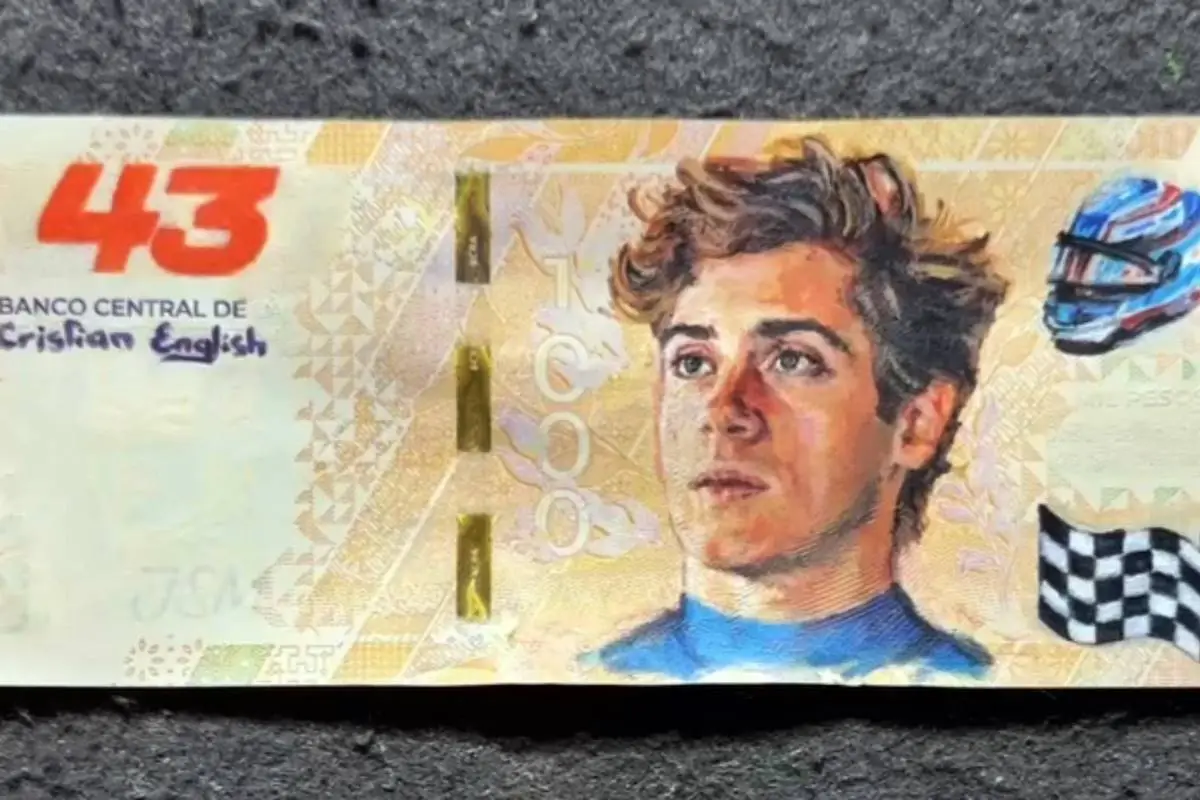 «Ahí va mi versión del billete de Franco Colapinto! En el frente del billete, pinté al corredor con su casco con la bandera Argentina y la bandera a cuadros. En el reverso, su auto está manejando en la plaza central de Pilar, con la clásica iglesia de fondo», indicó Cristian Anenglish, creador de esta obra de arte.